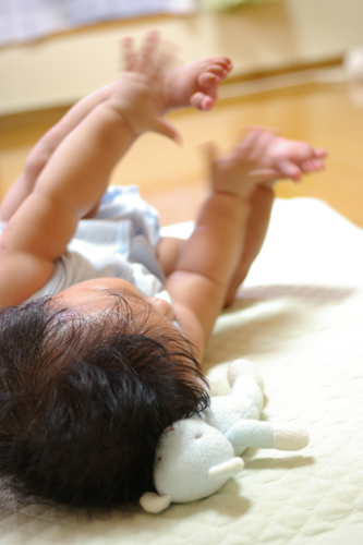 寝返りできるようになってから、ちょっぴり一人で遊んでくれるようになって、楽チン!
